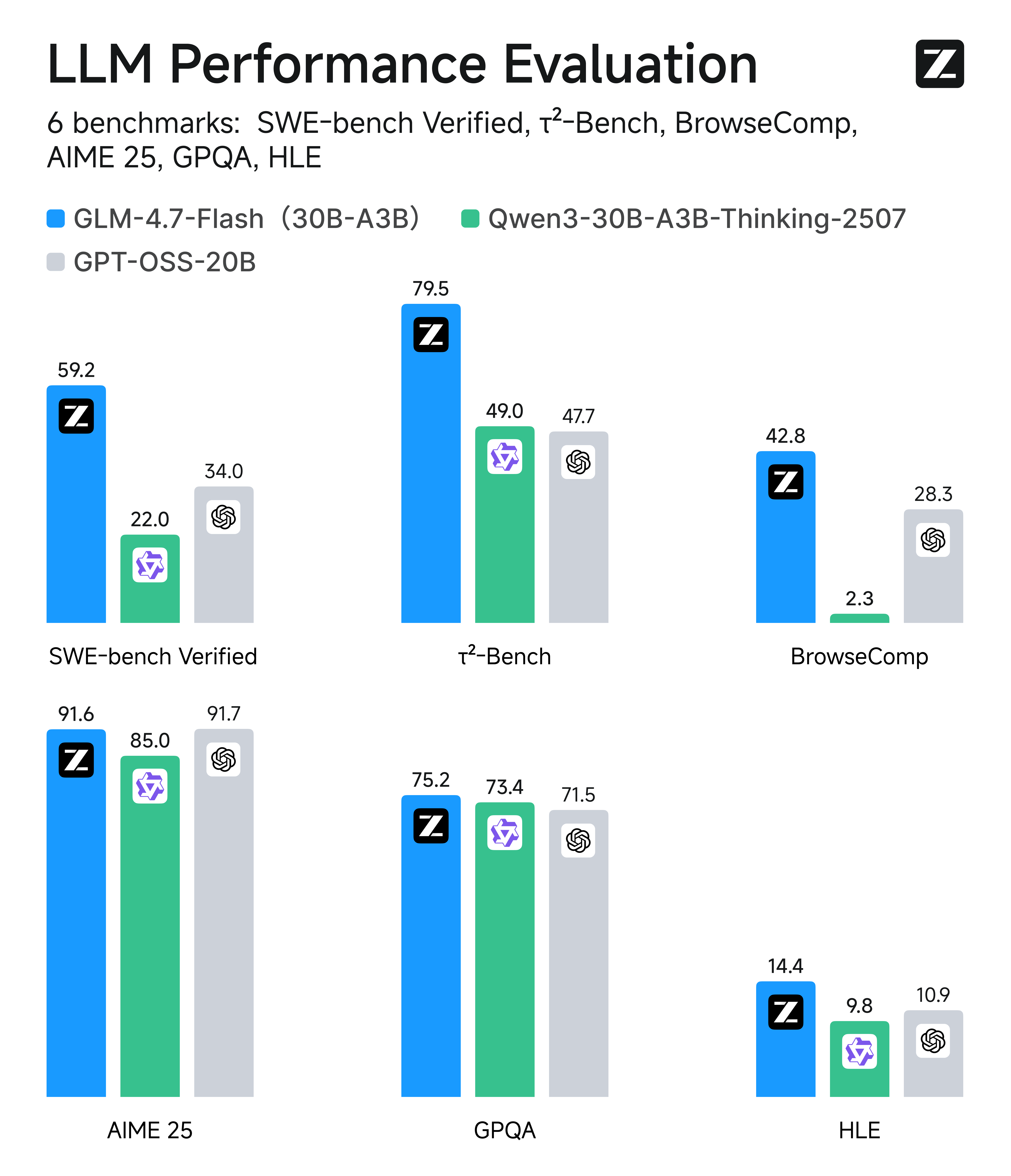 在SWE-bench Verified、τ²-Bench等主流基准测试中,GLM-4.7-Flash的综合表现超过gpt-oss-20b、Qwen3-30B-A3B-Thinking-2507,在相同和近似尺寸模型系列中取得开源SOTA分数。