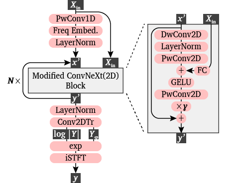 - 其一,模型结构升级,在 Vocos 基础上进行关键改进,将原有 1D 卷积替换为 2D 卷积,实现对频率子带的更高效建模,提升频谱特征解析精度;同时引入类 DiT 残差连接机制,可快速将输入频谱信息引入骨干 ConvNeXt 层,更充分地利用频谱条件,强化输入与输出的关联一致性。
